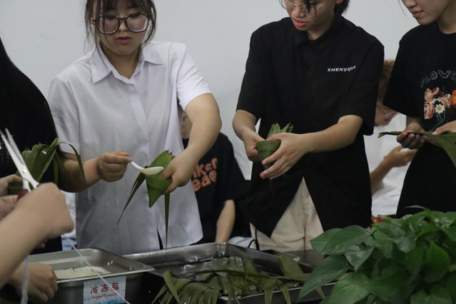 交流结束后,各位老师同学们分发了粽子,带领部分员工体验包粽子,同学们热情洋溢,专心投入,粽叶舞动,线绳穿梭,忙得不亦乐乎。正方形、三角形、五角形……各式各样的粽子陆续诞生。现场欢声笑语不断,大家都感受了传统技艺的魅力,也深刻体会到“自己动手,丰衣足食”的乐趣,相信吃到嘴里的粽子也是“别有风味”,饱含了家的味道、爱的味道。
