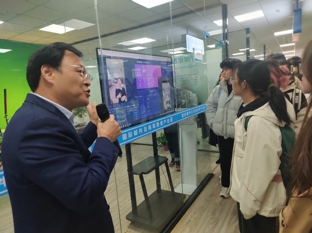 淮海经济区国际邮件互换局跨境产业园总经理薛奎热情接待了公司师生,对公司师生表示热烈欢迎。薛总简要介绍了园区当前的建设情况。徐州国际邮件互换局跨境产业园是淮海经济区首家集国际邮件、快件、跨境电商“三关合一”的海关监管生态园区,更是本市企业“立足徐州、辐射准海、通达全球”的对外经贸合作平台。公司师生在薛总的带领下实地参观了园区展厅、海外跨境商店、TIK TOK淮海运营中心、AI无人直播间等电商直播设施。薛总在参观过程中通过一系列成功案例,向师生展示了如何有效利用跨境电商平台扩展市场和提升品牌影响力,同时介绍了园区对新兴企业和老员工创业者的支持政策。