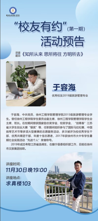 为充分发挥优秀员工对老员工成长的朋辈引领作用,积极搭建沟通交流平台,11月30日晚,beat365亚洲体育官方网站联合校关工委开展“员工有约”系列活动。本次活动特邀2019届旅游管理专业优秀员工于容海,在求真楼103做题为“知所从来·思所将往·方明所去”的分享会。2021级员工代表、公司全体员工干部聆听了讲座。